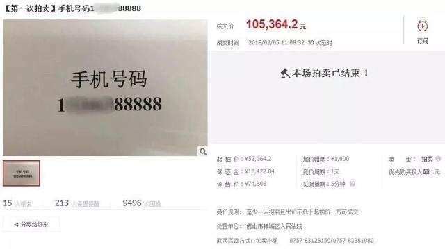 佛山一法院拍卖尾数“88888”佛山手机靓号,成交价超10万!