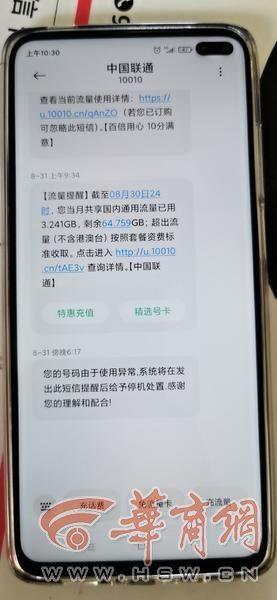 9月4日,华商报记者看到,徐先生的新手机号在8月31日收到联通客服的短信显示,徐先生的号码由于使用异常给予停机处理。